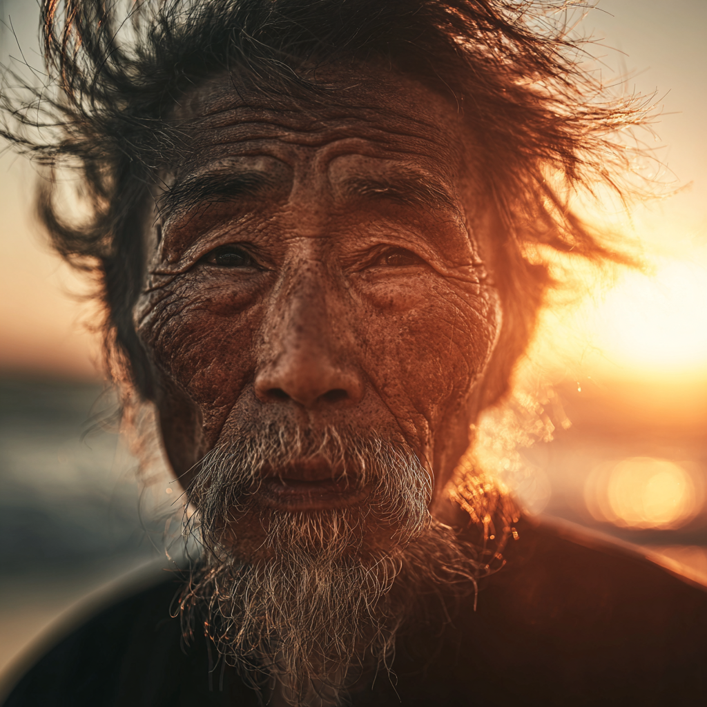 Photorealistic close-up portrait of an elderly Japanese fisherman, weathered